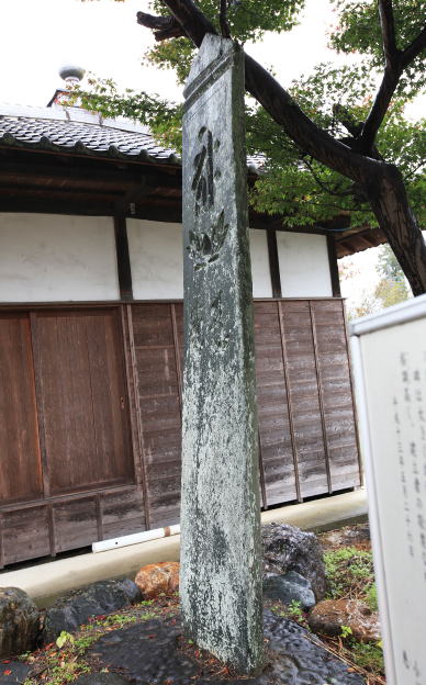 | 板碑は、やや「く」の字に曲っている。身部は、上方に阿弥陀三尊の種子を蓮華座上に、下方に華厳経に出る偈(げ)、その下に紀年銘を刻む。 | ||