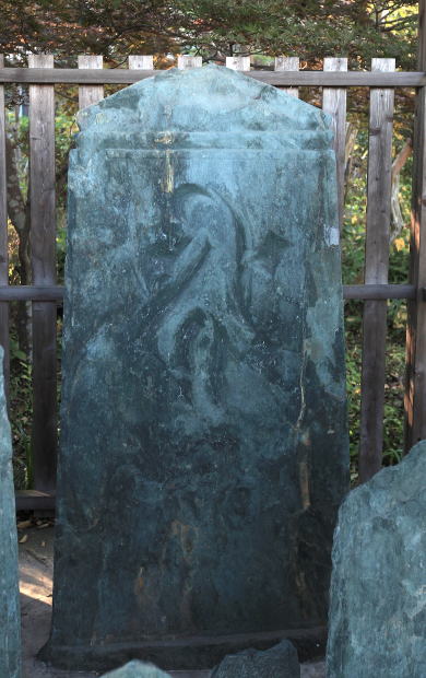 向徳寺 板碑群中、最も古い板碑で、鎌倉時代中期 建長年間(1249~56)の板碑に見られる特長を備えている。