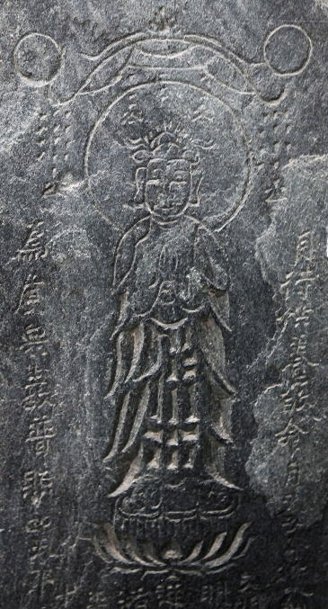 | 身部上方、勢至菩薩(蓮座上で合掌する)。 | 身部下方の刻銘 |