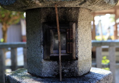 | 六角形の石燈籠は、本殿の玉垣内、向かって右側手前に置かれる | 火袋は、火口一面、丸窓一面で、他の四面は素面 |