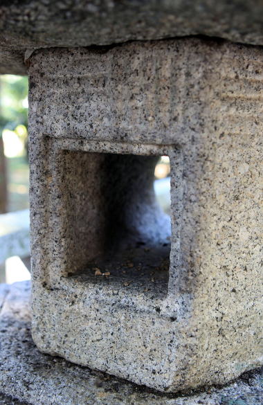| 竿(さお)は円柱で、中節のみ連珠文。石燈籠の保護金具が目ざわりで、作品の価値を下げていると同時に神社の景観も損ねている | ||