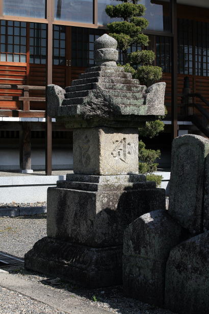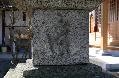 | 石塔は、門を入ってすぐ左手側に立っている。相輪の上半部を欠く | 塔身、月輪を薄く彫り、内に金剛界四仏の種子を刻む(キリーク:阿弥陀) |