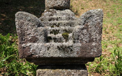| 県史跡、南北朝、花崗岩、塔身と相輪頂上の請花・宝珠は後補 | 基礎上端二段、側面は輪郭を巻き三茎蓮を陽刻する。格狭間はつくらない |