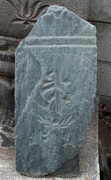 東葛地域を代表する武蔵型板碑で、碑面に阿弥陀三尊種子と光明真言を刻んでいる。鎌倉時代後期 元亨二年(1322)の紀年銘がある。