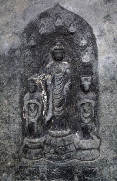 | 板碑は本堂に向かって左側の庚申堂に安置されている。身部表面を長方形に彫り沈め、中央に阿弥陀三尊立像を半肉彫りする | ||