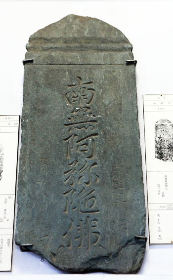 | 徳蔵寺(とくぞうじ)名号板碑 (南北朝時代中期 貞治二年 1363年、緑泥片岩、高さ 72.5Cm 下幅 30Cm) |