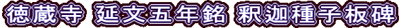 *西武新宿線「東村山駅」下車、北方向へ徒歩 約16分。徳蔵寺板碑保存館の板碑群は、整理が行き届いており、ここを拝観するだけで武蔵型板碑の概観を知ることができる。ぜひ、一見をお勧めしたい。(月曜日休館、拝観料 200円)。このページは、釈迦種子を主尊とする板碑と私年号を紹介しています。