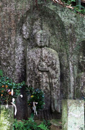 浄瑠璃寺から岩船寺の方向へ、少し歩くと右手の藪の中にあらわれる。当尾(とうの)の石仏群で最古の年号を持つ。