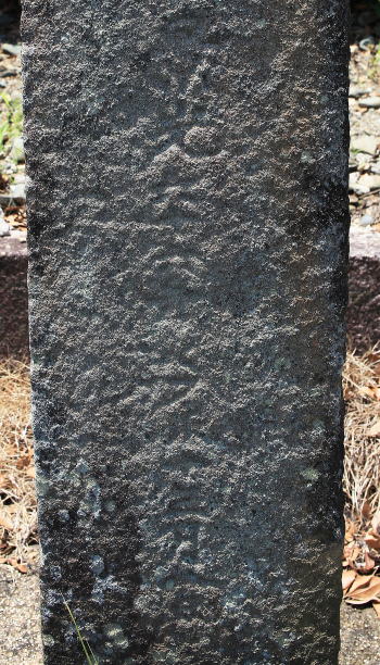 | 板碑上方、頭部山形は蓮弁様に反り、二条線は側面にまで及ぶ。 | 身部下方の刻銘 |