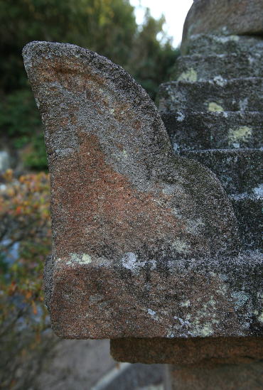笠の段形は、下は二段、上六段、隅飾は二弧輪郭付で先端がやや外傾し、内は無地