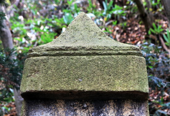 頭頂の山形が一部破損する。下に二段の切込、額部(がくぶ)は両端を面取りし、弧状に突出する